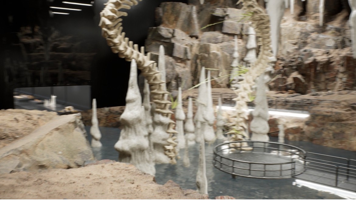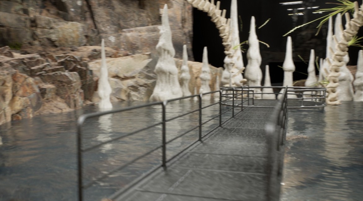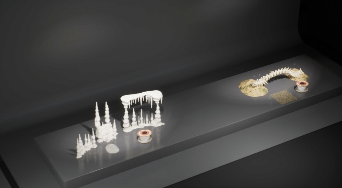Stalagmites – Are rising and falling organically from the cave floor/celling and are made of a bioengineered bacterium-based material. This innovative substance slowly disperses over time, contributing to the ecosystem. The bacteria release minerals and nutrients as they degrade, creating a fertile environment for subterranean ecosystems to develop.