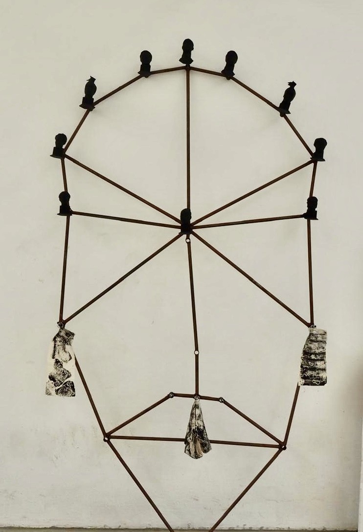 The structure is the face map used by the recognition software built from metal and displays human busts of the people used in the software model. Along with this, I created masks that could be used to hide from facial recognition cameras.
